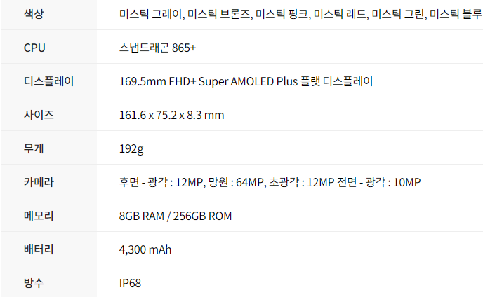 • Exynos 990 (한국 등) / Snapdragon 865+ (미국 등)