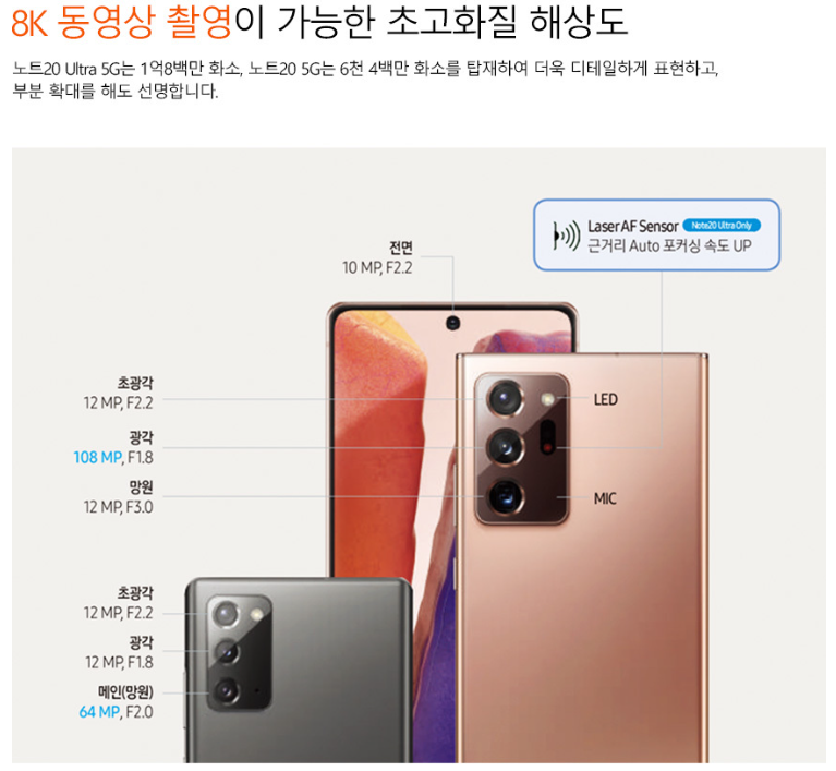 갤럭시 노트20 울트라는 전문가급 사진과 영상 촬영이 가능합니다. 8K 해상도의 초고화질 동영상 촬영도 지원합니다.