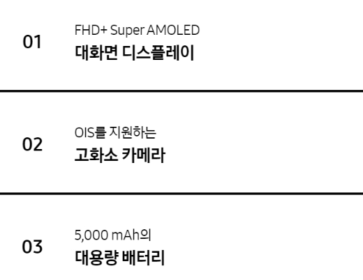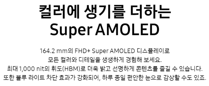 - 디스플레이: 6.5인치 FHD+ Super AMOLED 디스플레이는 선명한 화질과 생생한 색감을 제공합니다.
