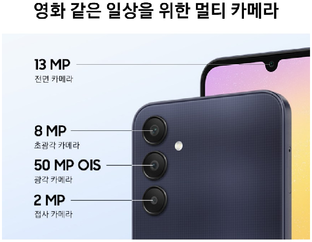 | 갤럭시 A25 카메라 | 후면: 50MP(메인) + 8MP(초광각) + 2MP(매크로) / 전면: 13MP |