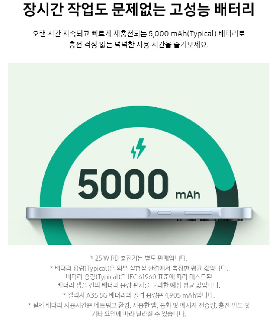- 갤럭시 A35 배터리: 대용량 5,000mAh