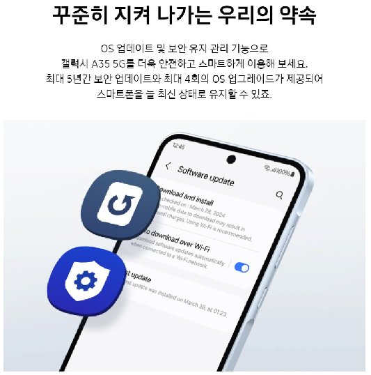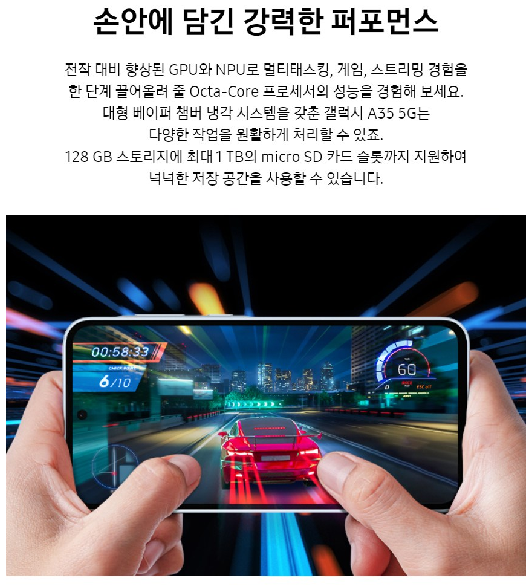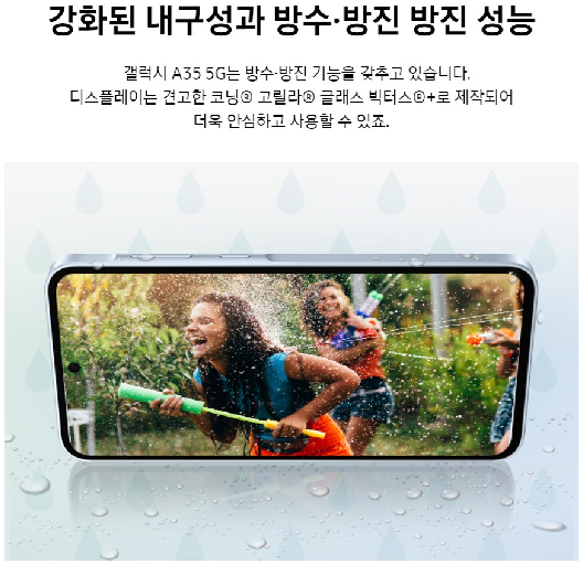 - 갤럭시 A35 저장공간: 128GB/256GB 옵션 (microSD로 확장 가능)