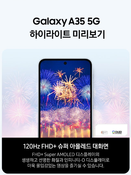- 갤럭시 A35 디스플레이: 6.6인치 Super AMOLED, FHD+ 해상도, 120Hz 주사율