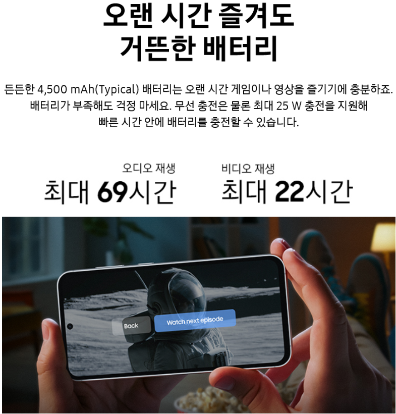 갤럭시 S23 FE는 4500mAh 대용량 배터리를 탑재하여 하루 종일 사용해도 충분한 배터리 수명을 제공합니다. 또한, 고속 충전 기능을 통해 짧은 시간 내에 배터리를 충전할 수 있어, 바쁜 일상 속에서도 편리하게 사용할 수 있습니다. 갤럭시 S23 FE는 무선 충전 기능도 지원하여, 케이블 없이 간편하게 충전할 수 있습니다.