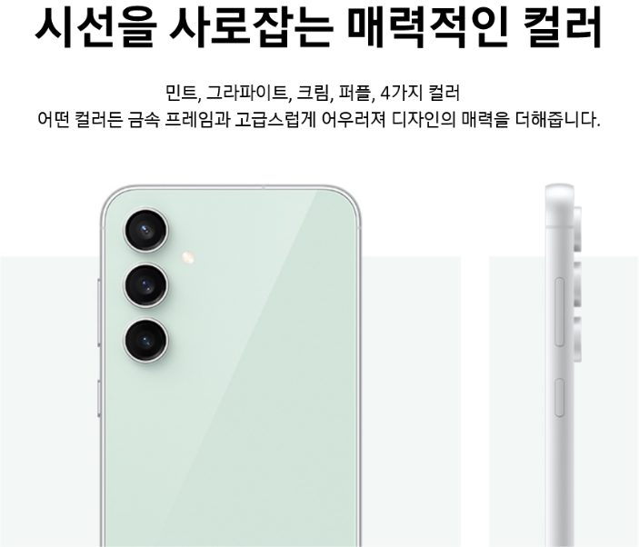 갤럭시 S23 FE는 세련된 디자인과 다양한 색상 옵션을 제공합니다. 크림, 그라파이트, 라벤더, 올리브 등 다양한 색상 중 선택할 수 있어, 개인의 취향에 맞게 선택할 수 있습니다. 또한, 슬림하고 가벼운 디자인으로 휴대성이 뛰어나며, 한 손으로도 편리하게 사용할 수 있습니다.