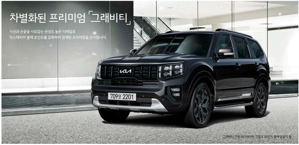 모하비의 외관은 한 마디로 '압도적'입니다. 웅장한 차체와 세련된 디자인의 조화가 눈길을 사로잡습니다. 특히 그래비티 모델의 경우, 블랙 컬러 포인트로 더욱 고급스러운 느낌을 자아내죠. 도로 위에서 모하비를 마주치면, 누구나 두 번 돌아볼 수밖에 없을 거예요!