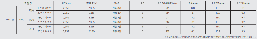 - 18인치 타이어 (7인승): 복합 9.1km/L (도심 8.0km/L, 고속도로 10.9km/L)