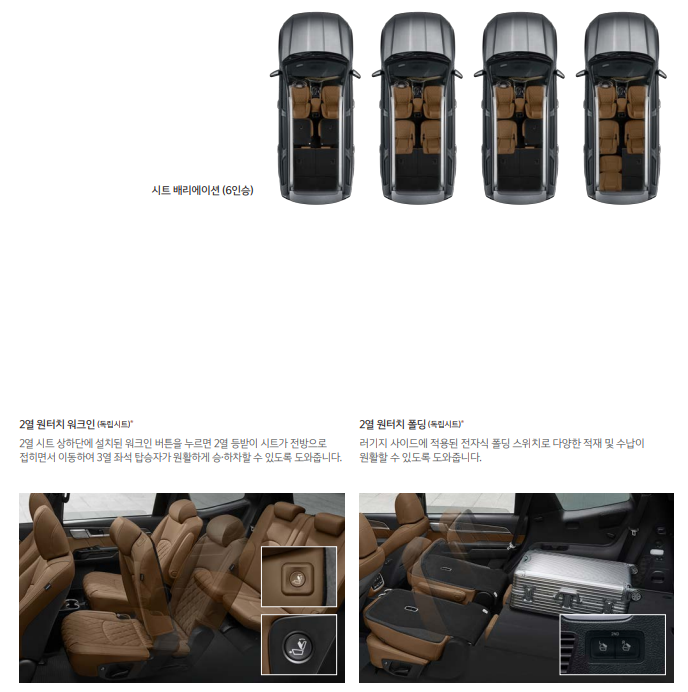 이런 다양한 옵션들로 여러분의 모하비를 더욱 특별하게 만들 수 있습니다. 특히 6인승 옵션은 가족 여행이나 비즈니스용으로 사용하시는 분들에게 매우 유용할 것 같아요.