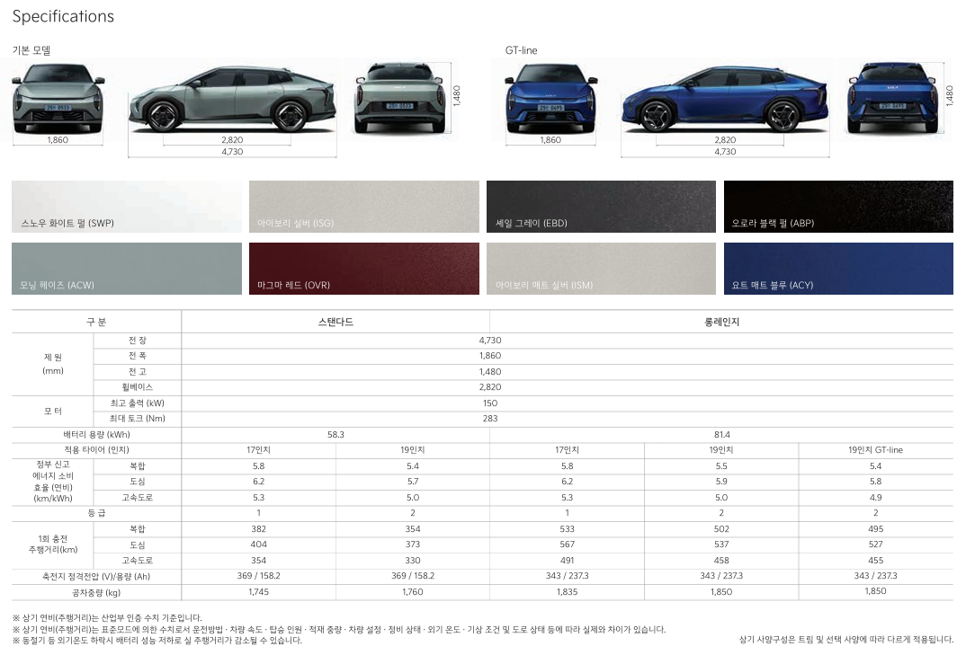 | 모델명 | 주행거리 (WLTP 기준) | 배터리 용량 | 가격대 |