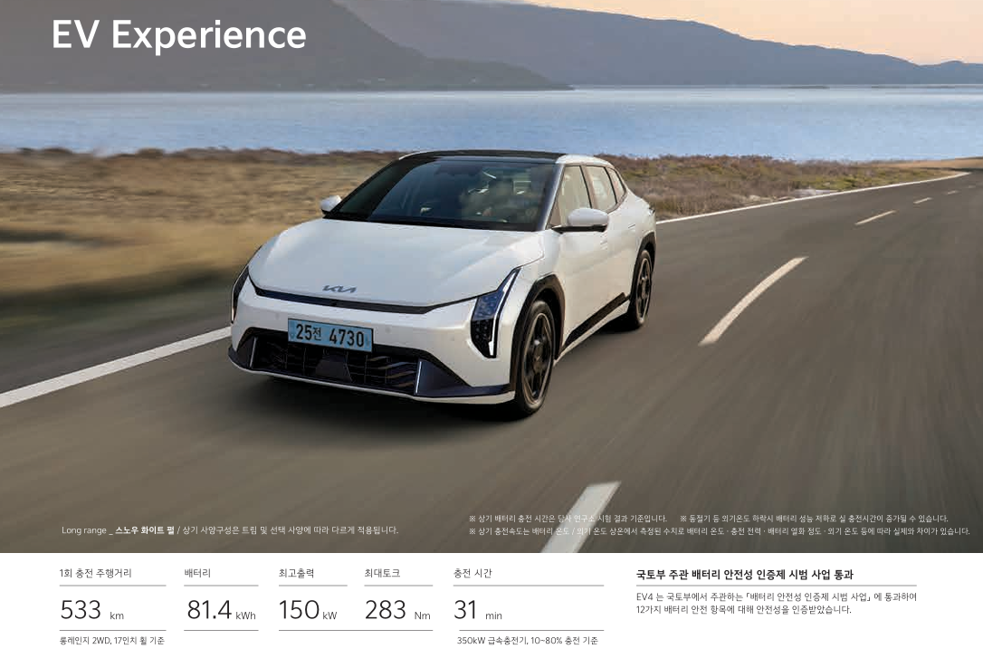 | EV4 | 400~450km | 58kWh | 3,400~4,000만 원대 |