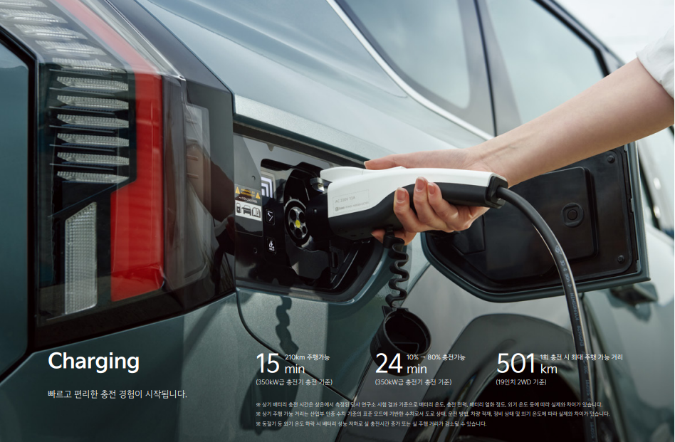 또한, 350kW급 초급속 충전을 지원해 약 15분 충전으로 239km를 주행할 수 있습니다. 바쁜 일상 속에서도 충전 걱정을 덜어주는 효율적인 충전 성능이죠.