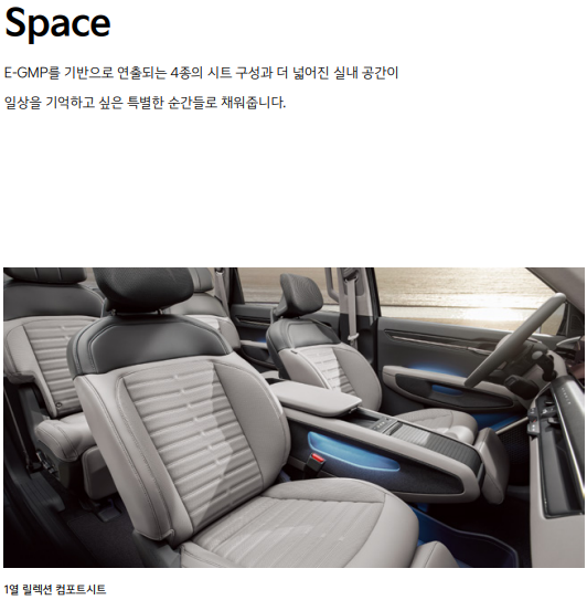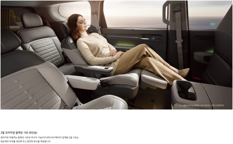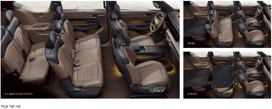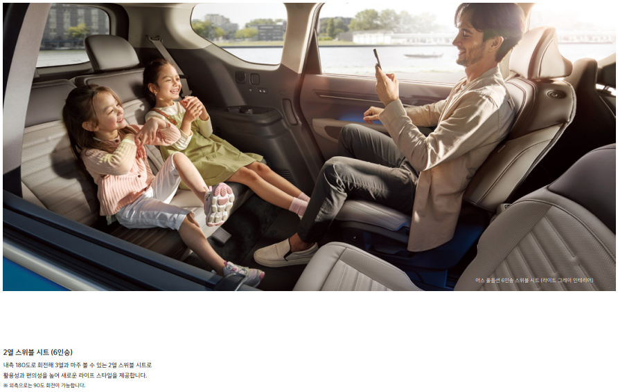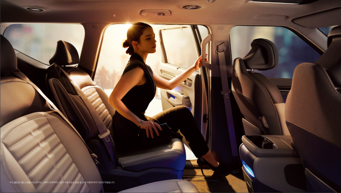 - 6인승/7인승 선택 가능: 6인승은 독립형 캡틴 시트를 제공해 더욱 안락한 승차감을 제공합니다.