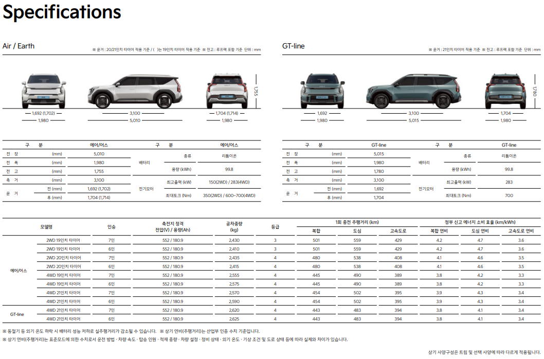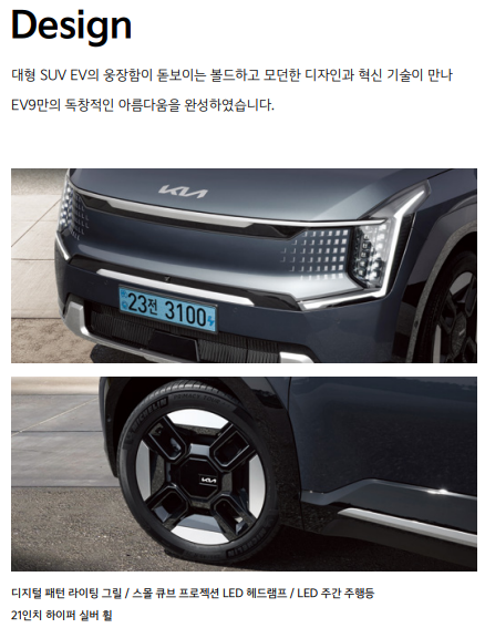 이와 같은 제원은 EV9이 대형 SUV로서의 공간 활용성과 전기차의 효율성을 동시에 충족시킨다는 것을 보여줍니다.