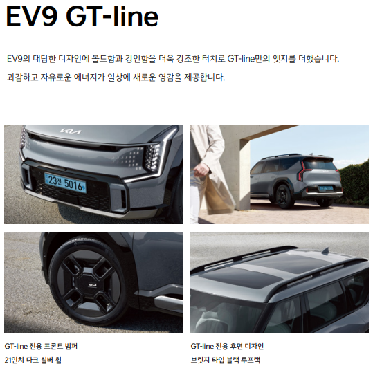 EV9 GT-Line | 약 9,500만 원 이상 | 듀얼 모터(AWD), 고성능 모델, 스포티한 디자인 |