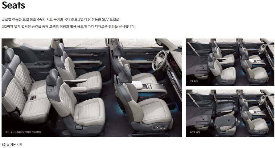 EV9은 대형 SUV인 만큼 넉넉한 실내 공간을 제공합니다. 기본적으로 7인승으로 출시되며, 6인승 옵션을 선택하면 독립형 캡틴 시트를 사용할 수 있어 더욱 편안한 승차감을 느낄 수 있습니다.