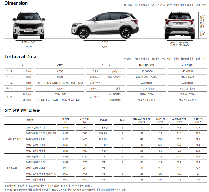 - 셀토스 1.6 터보: 평균 10.8km/ℓ (도심), 12.8km/ℓ (고속)