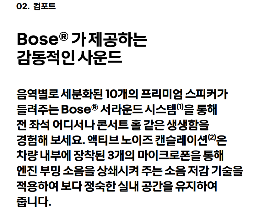 "풀옵션으로 구매했는데, 가격 대비 정말 훌륭한 옵션들이 많아요. 특히 BOSE 사운드 시스템은 정말 대만족입니다." - 이OO 님 (42세, 자영업)