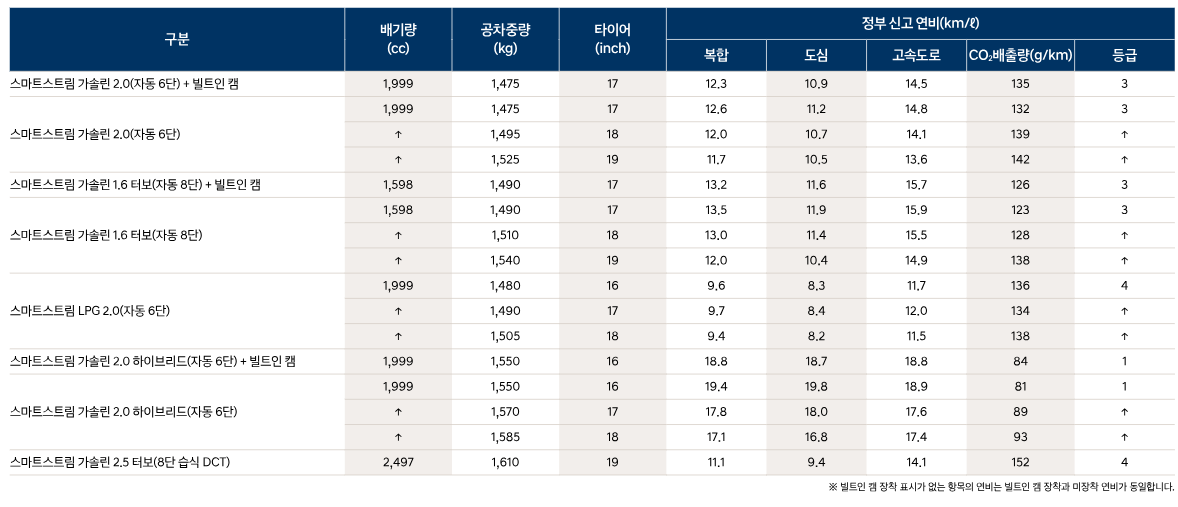 - 연비: 가솔린, LPG, 하이브리드 중 어떤 엔진이 본인에게 적합한지 생각해 보세요.
