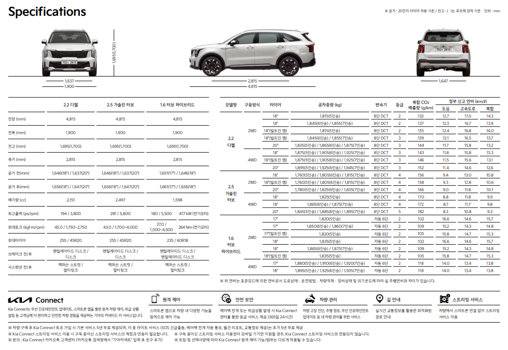 쏘렌토의 상세 제원을 알아보겠습니다. 이 정보들은 여러분의 차량 선택에 중요한 기준이 될 수 있습니다.