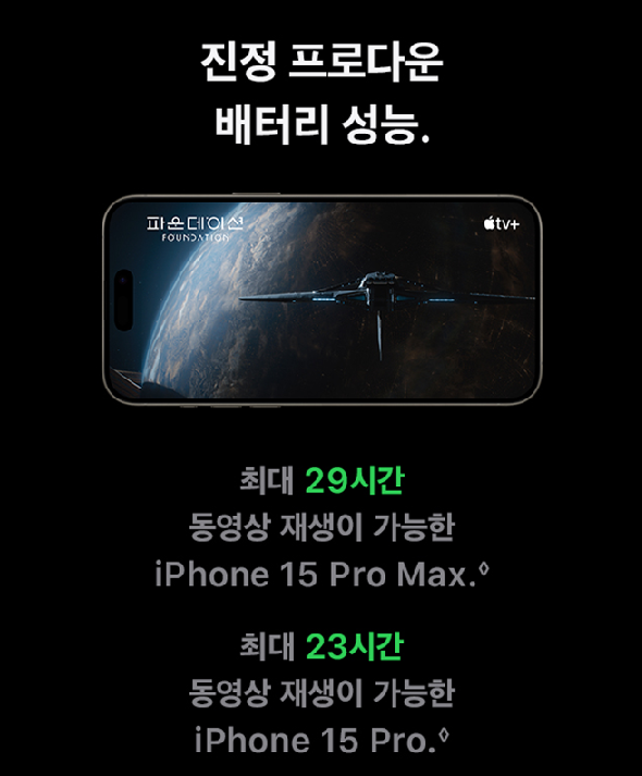 - 아이폰 15 프로 배터리 수명: 최대 23시간 비디오 재생