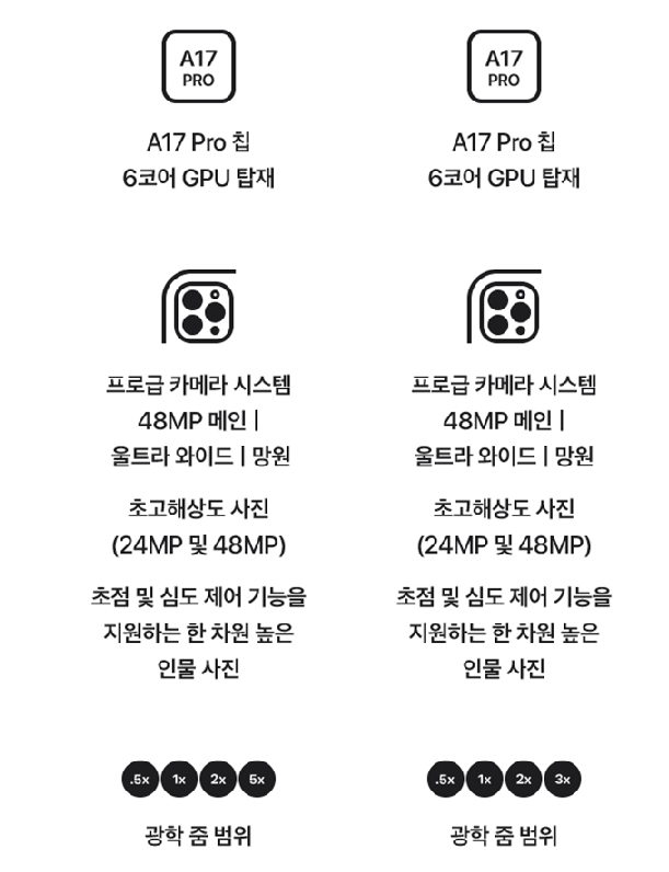 | 아이폰 15 프로 메인 카메라 | 48MP, 더 큰 센서 | 48MP |