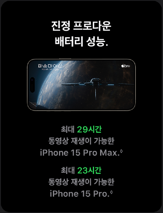 • 아이폰 15 프로 맥스 최대 29시간의 비디오 재생 시간