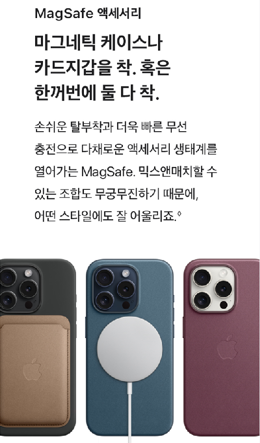 • 아이폰 15 프로 맥스 MagSafe 무선 충전 지원 (최대 15W)
