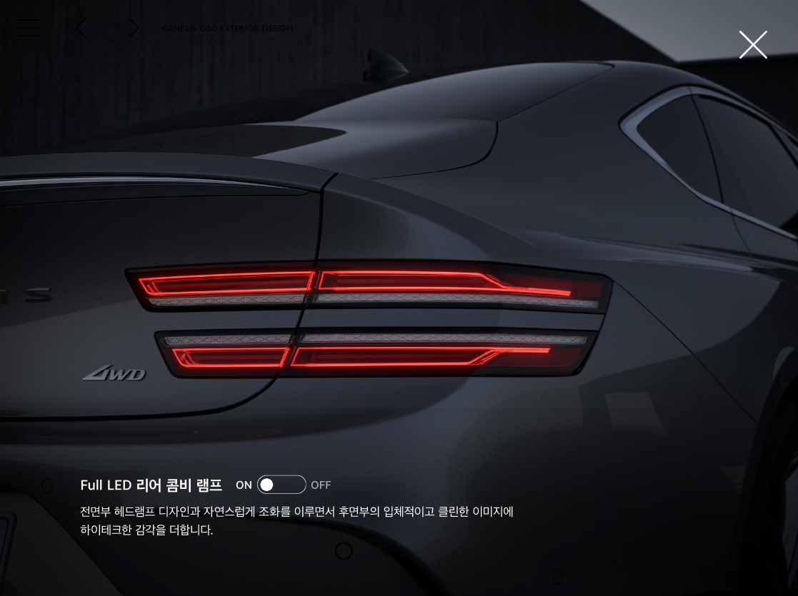 - 전면부: 제네시스의 시그니처 크레스트 그릴과 쿼드 램프 디자인.