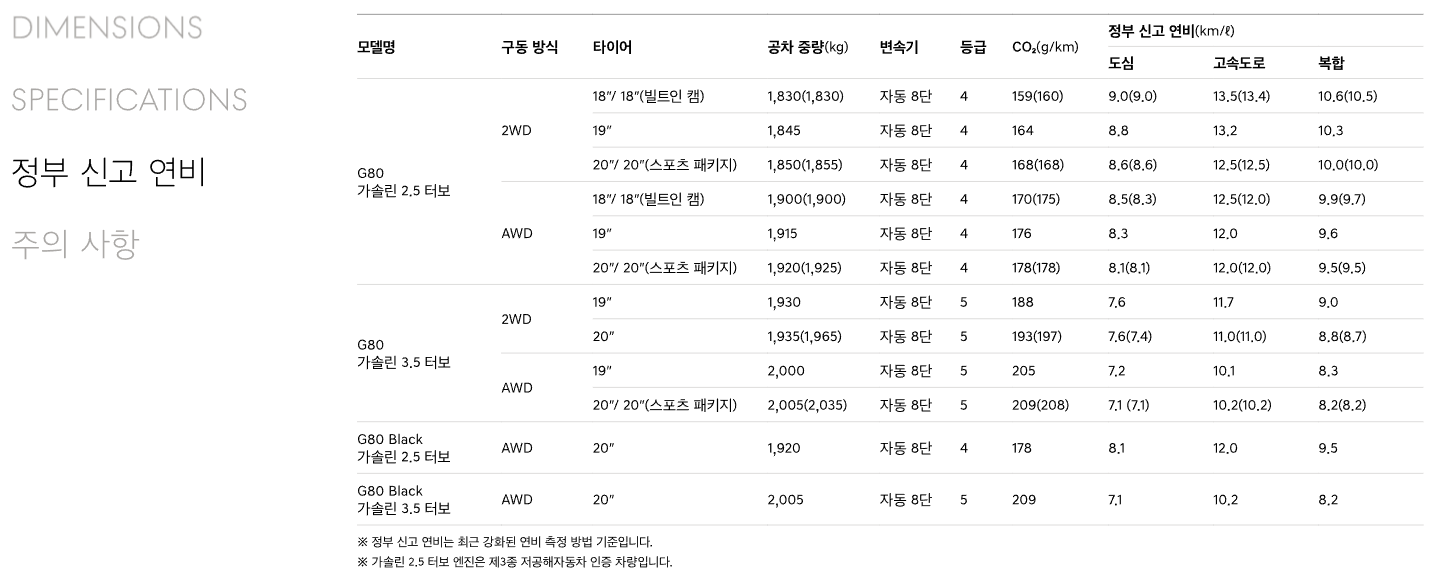 연비는 차량 유지비를 결정짓는 중요한 요소입니다. 제네시스 G80의 트림별 연비는 다음과 같습니다.