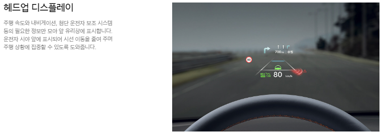 - 헤드업 디스플레이: 주행 정보를 윈드실드에 투사하여 안전 운전을 돕습니다.