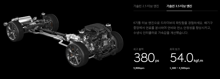 - "3.5 가솔린 모델의 파워는 정말 대단해요. 중형 SUV라는 게 믿기지 않을 정도의 퍼포먼스를 보여줍니다."