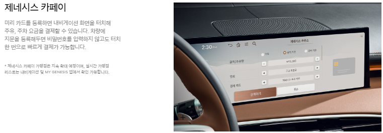 - 제네시스 카페이: 차량 내에서 간편하게 결제할 수 있는 시스템입니다.