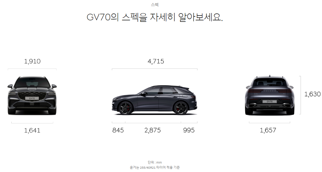 | 제네시스 GV70 윤거(전/후) | 1,647mm / 1,661mm |