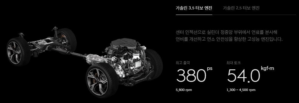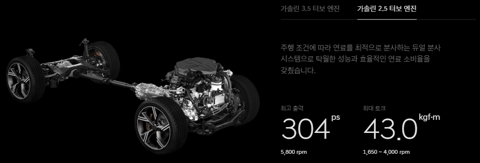 "어떤가요? 이 정도 성능이면 고속도로에서 자신감 넘치게 달릴 수 있겠죠? 2.5T와 3.5T 중 어떤 엔진이 더 끌리시나요? 파워를 원한다면 3.5T, 연비를 중시한다면 2.5T가 좋은 선택이 될 거예요!"