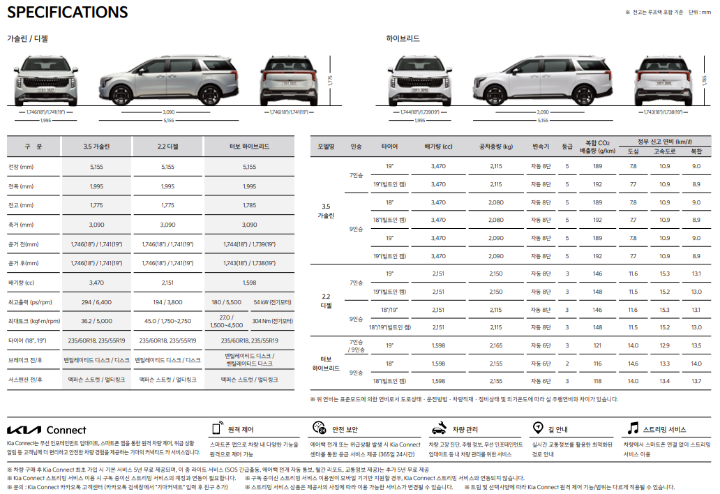 - 카니발 가솔린 3.5: 복합 9.1km/ℓ (도심 7.8km/ℓ, 고속도로 10.9km/ℓ)