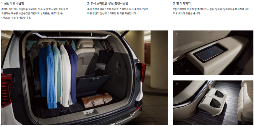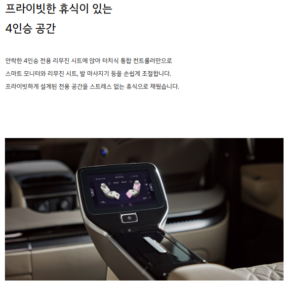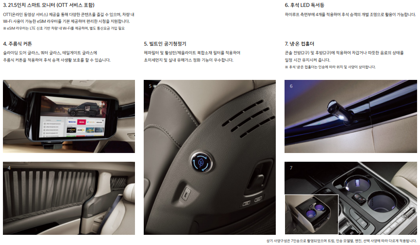 - 21.5인치 스마트 모니터: 뒷좌석에서 영화 감상, 인터넷, 게임 등을 즐길 수 있습니다.