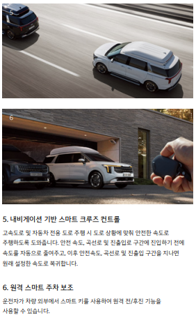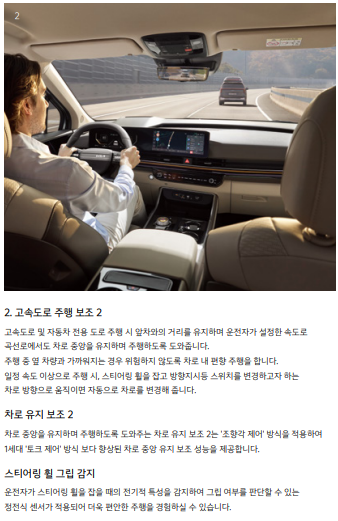 - 고속도로 주행 보조: 고속도로 주행 시 차선 유지, 앞차와의 거리 유지 등을 보조하여 안전한 주행을 돕습니다.