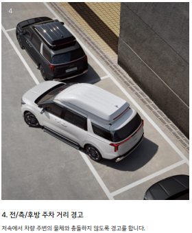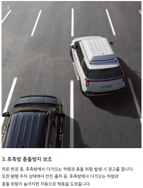 - 후측방 충돌방지 보조: 차로 변경 시 후측방 차량과의 충돌 위험을 감지하여 경고해 줍니다.