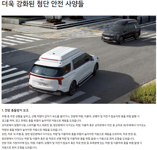 - 전방 충돌방지 보조: 전방 충돌 위험 시 자동으로 제동을 보조하여 사고를 예방합니다.