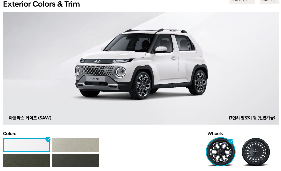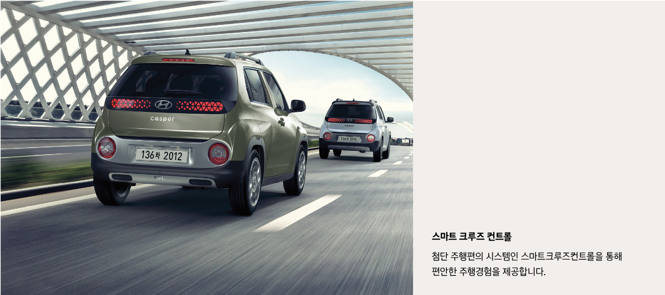 | 캐스퍼 스마트 | 13,850,000원~ | - 기본 안전 사양 탑재 - 15인치 스틸 휠 - 4.2인치 슈퍼비전 클러스터 |