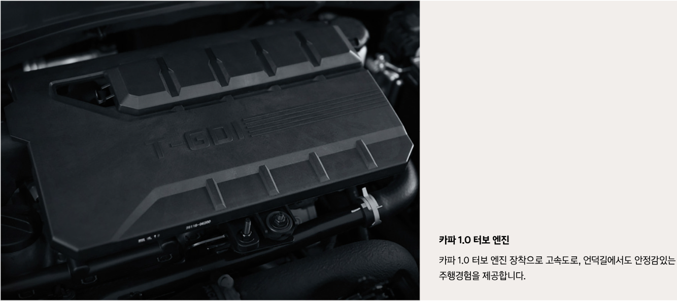 - 성능도 함께 고려: 1.0 T-GDI 터보 엔진 선택