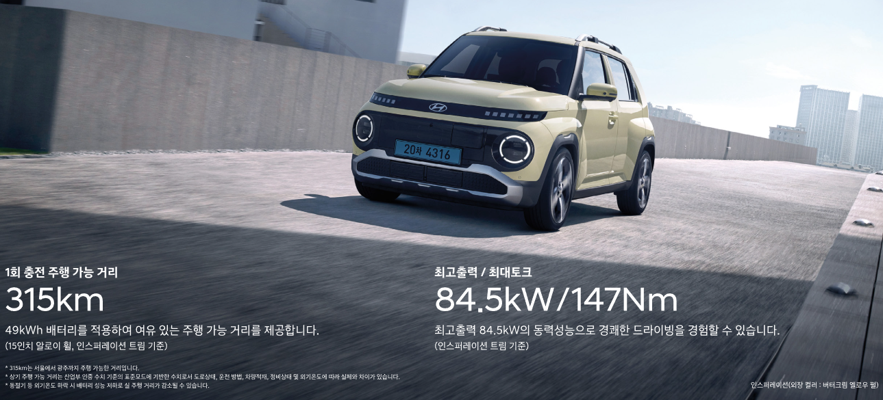 캐스퍼 일렉트릭은 소형 SUV이지만, 전기차 특유의 강력한 성능을 자랑합니다. 특히, 도심 주행과 장거리 여행 모두에 적합한 배터리 용량과 주행거리를 제공합니다.