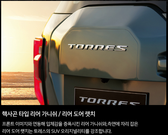 여러분은 어떤 옵션이 가장 매력적으로 느껴지시나요? 자신의 라이프스타일에 맞는 옵션을 선택해 토레스를 나만의 차로 만들어보세요.