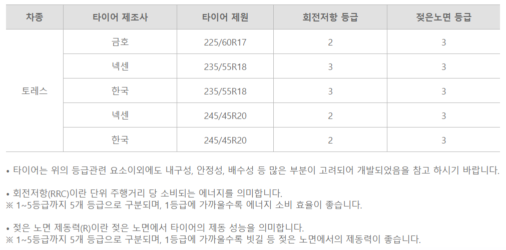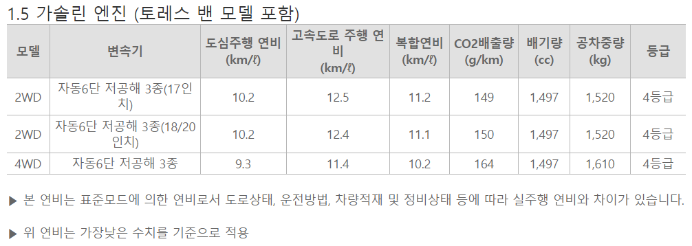 연비는 차량 선택에 있어 매우 중요한 요소죠. 카눈에 따르면, 2024년형 더 뉴 토레스의 연비는 다음과 같습니다: