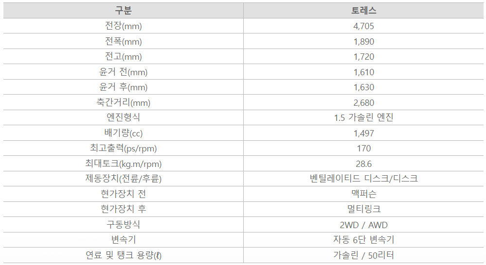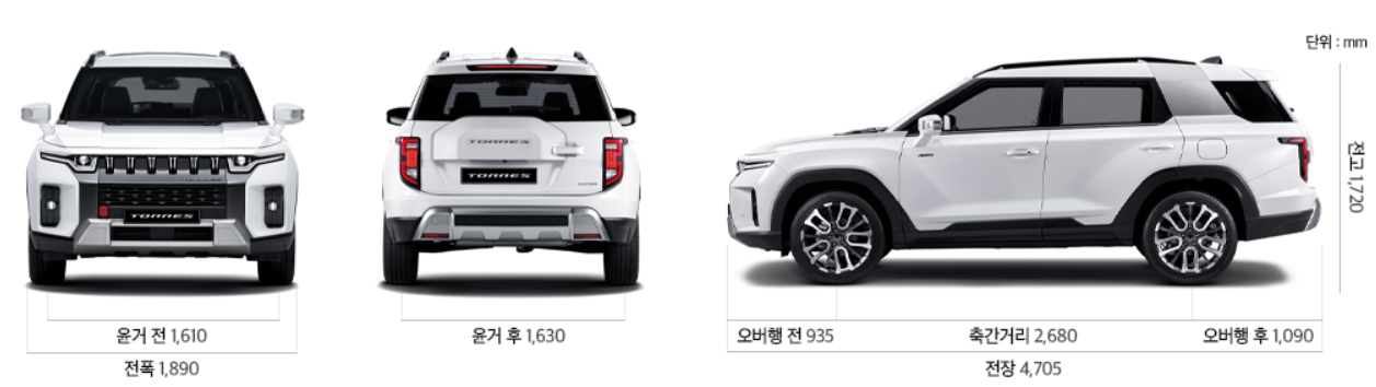 이제 토레스의 제원을 살펴볼 차례입니다. 다나와 자동차에서 제공하는 정보를 바탕으로, 2024년형 더 뉴 토레스의 주요 제원을 정리해보았습니다.