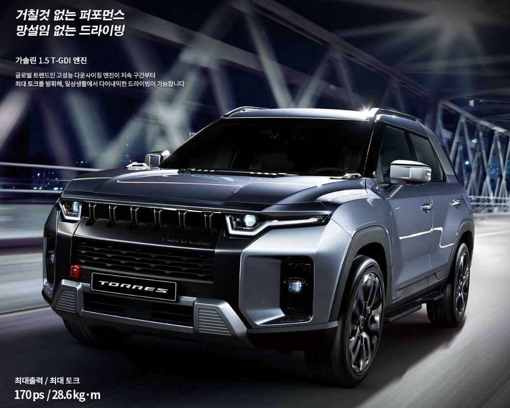 이 제원을 보면 토레스가 얼마나 강력한 성능을 자랑하는지 알 수 있죠. 특히 1.5L 가솔린 터보 엔진은 170마력의 강력한 힘을 뿜어냅니다. 이는 도심에서의 주행은 물론, 장거리 여행에서도 충분한 파워를 제공할 것입니다.