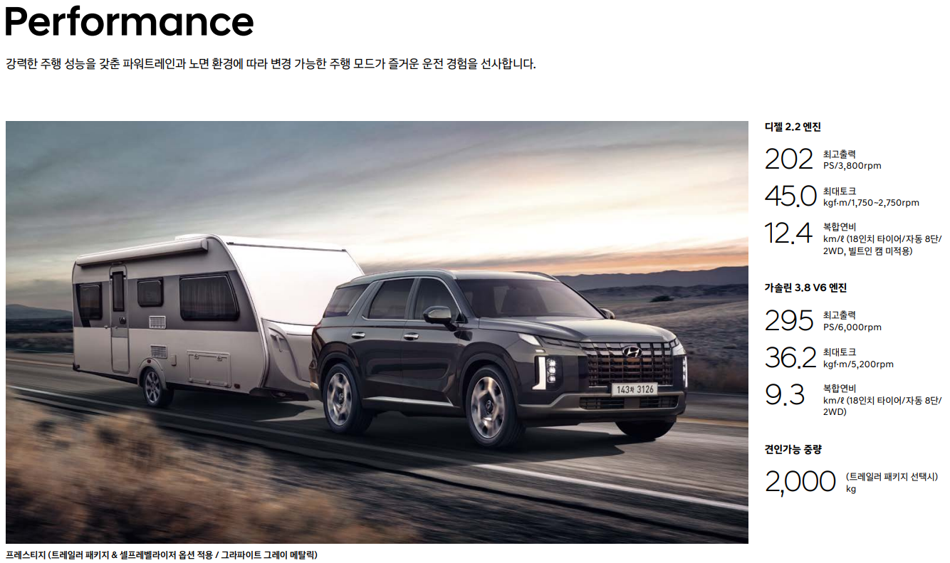 이러한 뛰어난 제원으로 팰리세이드는 도심과 고속도로를 가리지 않고 안정적인 주행을 제공합니다. 특히 디젤 엔진의 강력한 토크는 장거리 여행이나 화물 운송 시 큰 도움이 됩니다. 여러분의 라이프스타일에 맞는 엔진은 무엇인가요? 🚗💨