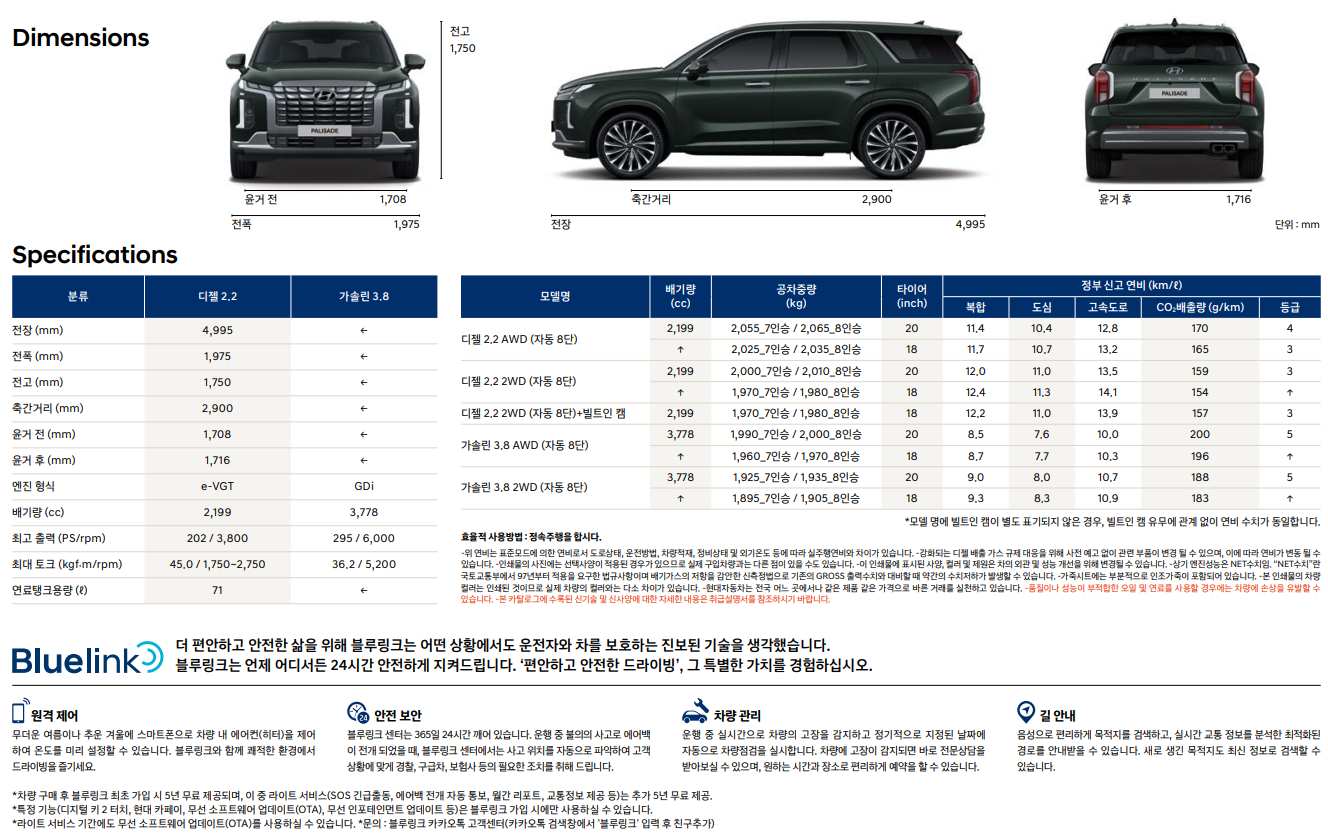 - 팰리세이드 엔진: 가솔린 3.8 V6 엔진 / 디젤 2.2 엔진
