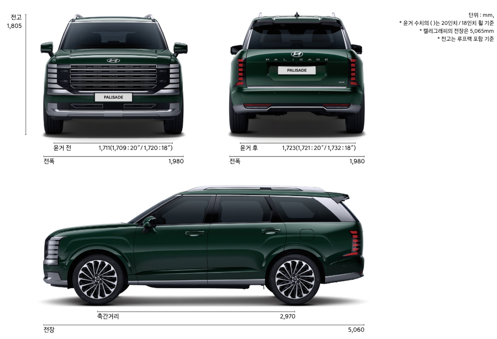 - 차체 크기: 4,980mm (길이) x 1,975mm (너비) x 1,750mm (높이)