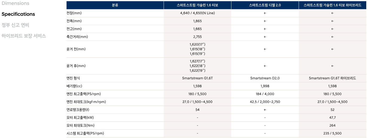 투싼은 다양한 엔진 옵션과 뛰어난 성능으로 운전자들에게 만족감을 제공합니다. 아래는 투싼의 주요 제원입니다.